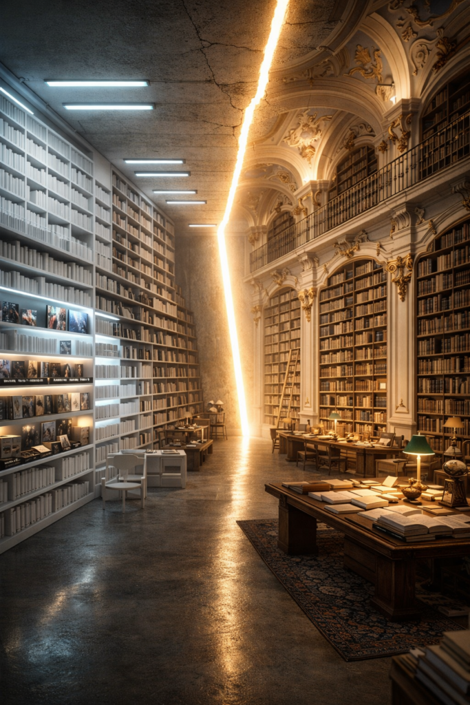 These two sides are not completely separated. They slowly mix into each other, just like Montag’s thoughts. The bright crack from the exterior continues into the interior, cutting through the library and connecting both worlds. Some meaningless shelves begin to hold real books, and modern elements appear next to old ones. This shows that Montag is changing, but he is not fully transformed yet.