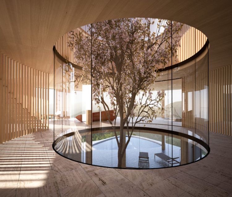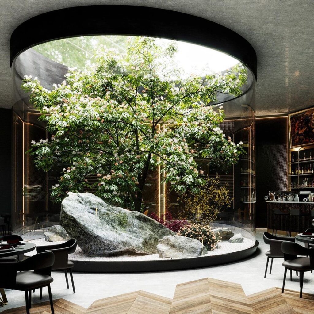 “What is a zen garden?” you might ask. A glass-covered indoor Zen garden is a modern interpretation of the traditional Zen garden, often placed at the center of a house. Enclosed by glass walls or a glass roof, it allows natural light in while remaining protected from the outdoors. Rather than being used physically, it acts as a visual calm zone, bringing stillness, balance, and a connection to nature into the heart of the home. Inside Taipei 101, a Zen garden can be used in a simple and modern way. Instead of a real outdoor garden, it could be a glass-enclosed indoor space with stones, calm colors, soft light, and very little decoration. This quiet space would create a strong contrast to the busy, fast-moving feeling of a skyscraper. It would give people a place to pause, relax, and feel calm, while also reflecting ideas of balance, simplicity, and harmony found in Zen design. My inspiration pictures are down below.